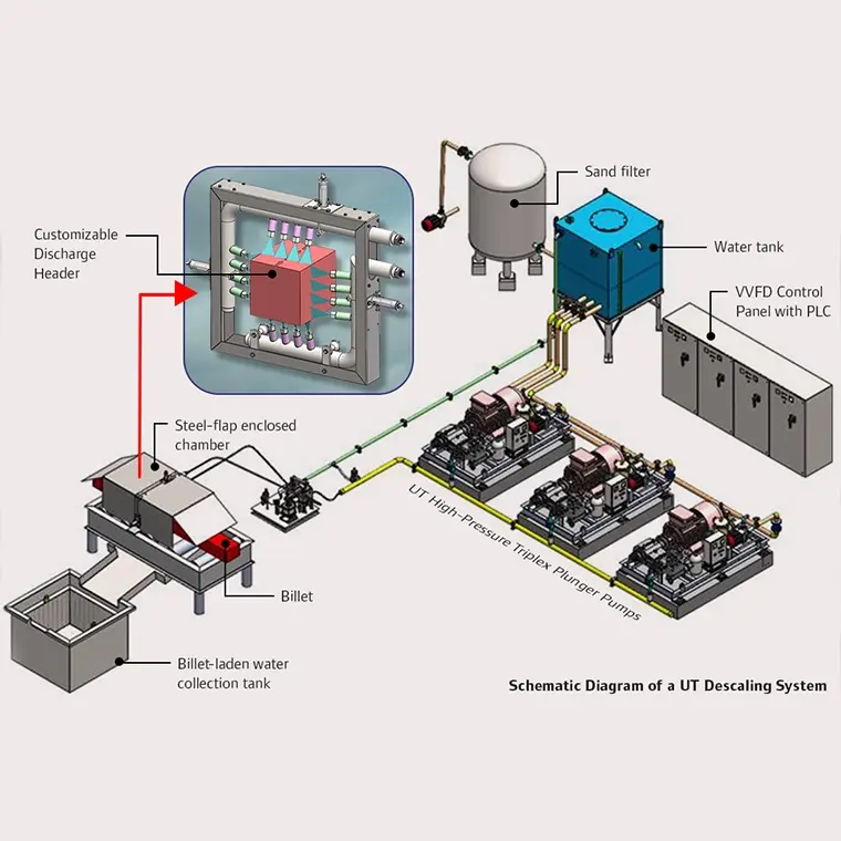The UT Descaling System consists of the following key components, each designed to ensure efficient and precise scale removal from hot metal surfaces: